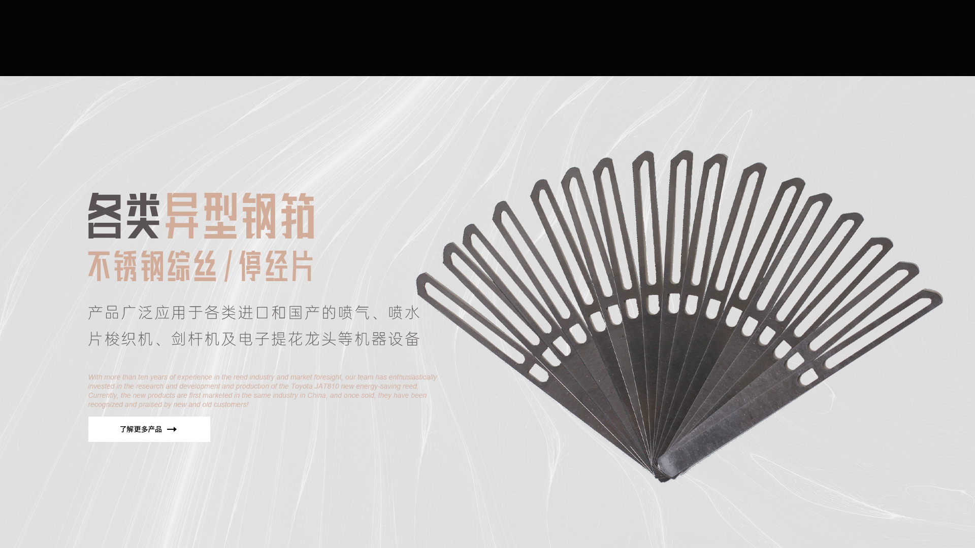 從事研發(fā)生產(chǎn)及銷售各類新型紡織器材的生產(chǎn)型企業(yè)。公司主要產(chǎn)品有:噴氣織機用各類異型鋼筘(傳統(tǒng)型豐田JAT710鋼筘及新研發(fā)的豐田JAT810節(jié)能筘);不銹鋼綜絲及不銹鋼停經(jīng)片。我們的產(chǎn)品廣泛應(yīng)用于各類進口和國產(chǎn)的噴氣、噴水、片梭織機、劍桿機及電子提花龍頭等機器設(shè)備。